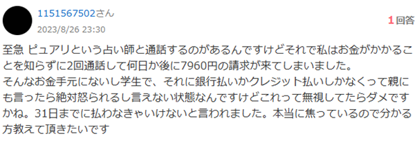 ちょっと常識では分からない投稿ですが、有料のサービスを使った上で請求が来て困っているという謎の投稿となっています。ピュアリではクレジットカード払いや銀行振り込み、コンビニ支払いなど沢山の支払い方法が用意されていてその中に「atone」と言うものがあります。