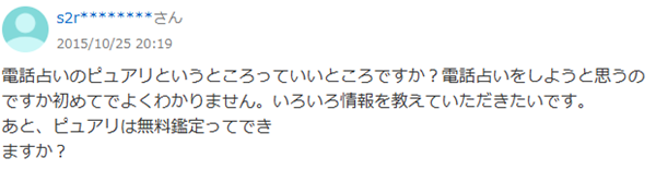まず最初は電話占いを利用しようと考えている人が、どのサービスを使ったら良いのかを検討していると言った相談となっていました。最後に「ピュアリは無料鑑定できますか?」とありますが、これが聞きたいんでしょうね。公式サイトを見たらすぐに分かる事なんですが、何故自分で見ないのか・・・