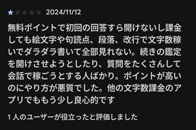 よくこういった相談アプリで低評価を貰う理由に「鑑定士の言葉使い」と言うものがあります。昔いた細木数子さんと言う方はズバリと言うスタイルが受けてテレビによく出てましたよね。ただ中にはそういった答え方や言葉の鋭さを嫌う方も当然います。