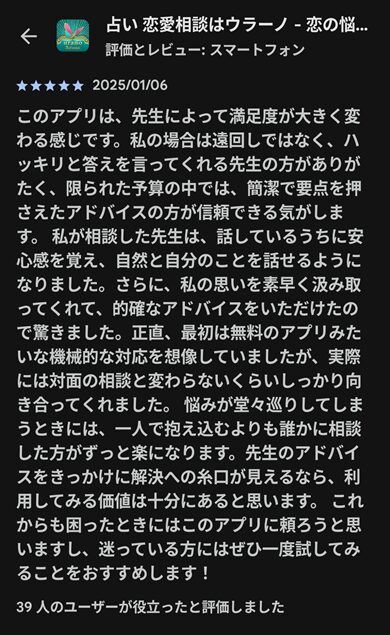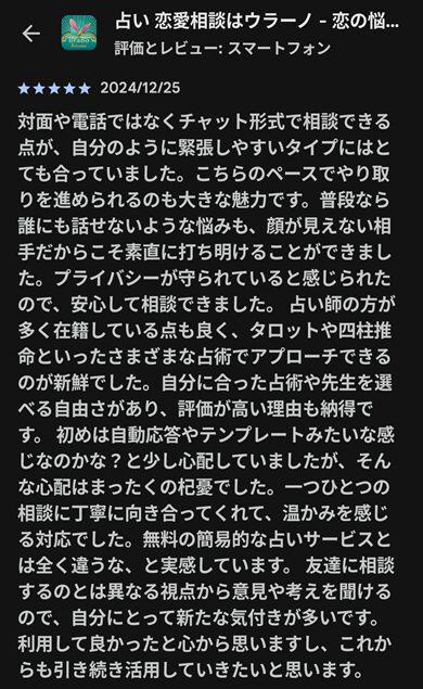 ウラーノを使っていて句読点や絵文字でダラダラ文章を引き延ばしているのであれば、恐らくはウラーノ公式での口コミでもそういった内容が掲載されています。どこが評価されているか、文章の簡潔さですか?恐らくは当たるとか、寄り添ってくれたとかそういった部分が評価されているはずです。