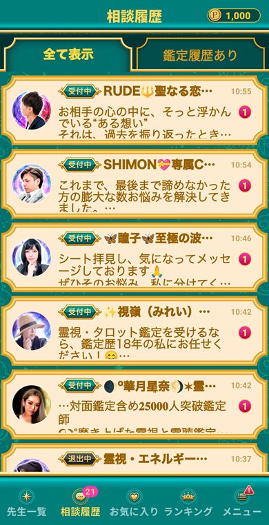 ウラーノで登録作業を終えると在籍している鑑定士からどんどんメッセージが届きます。一番下に並んでいるメニューから先生一覧を選択しこちらから選ぶことも可能。