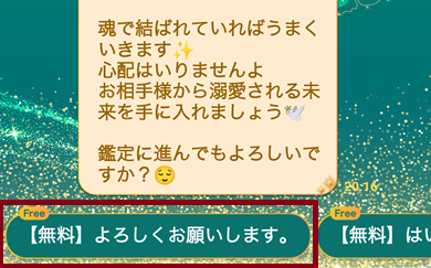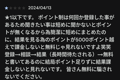 この10文字毎の単価はこちらからの送信の文章、それに鑑定士や占い師からの返信を開く時に必要となります。返信が長文になるので、まとまったポイントが必要となります。口コミで最低評価のコメントを投稿されている方は無料で見れると思ったのに鑑定結果にはまとまったポイントが必要になるので、ここで否定的な評価を下しています。