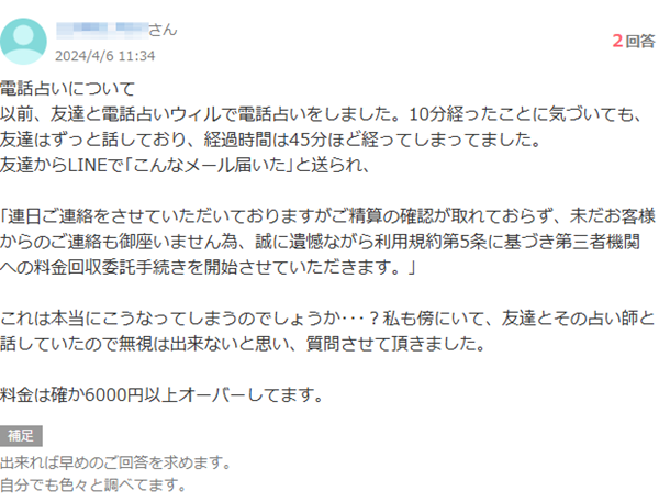当たり前の事なのに自分が被害者かのように質問してて驚愕した内容です。中身は恐らく「登録時に貰えるキャンペーンを使い鑑定士と10分無料で相談していて止まらず45分もの長時間の会話で想定していなかった支払いに直面している」って感じなのでしょう。