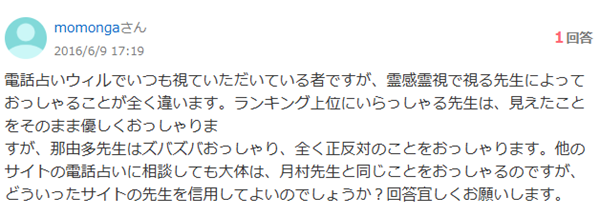厳しいはっきりとした事を言われたい方、優しく諭されたい方。不倫を続けるべきなのか、新たな恋に行く方が幸せなのか。守護霊は何を言っているか、自分のニーズに合わせた相談がこの口コミの結果を見るだけで分かります。まずはここを見る事から始めるのも良いかもしれません。